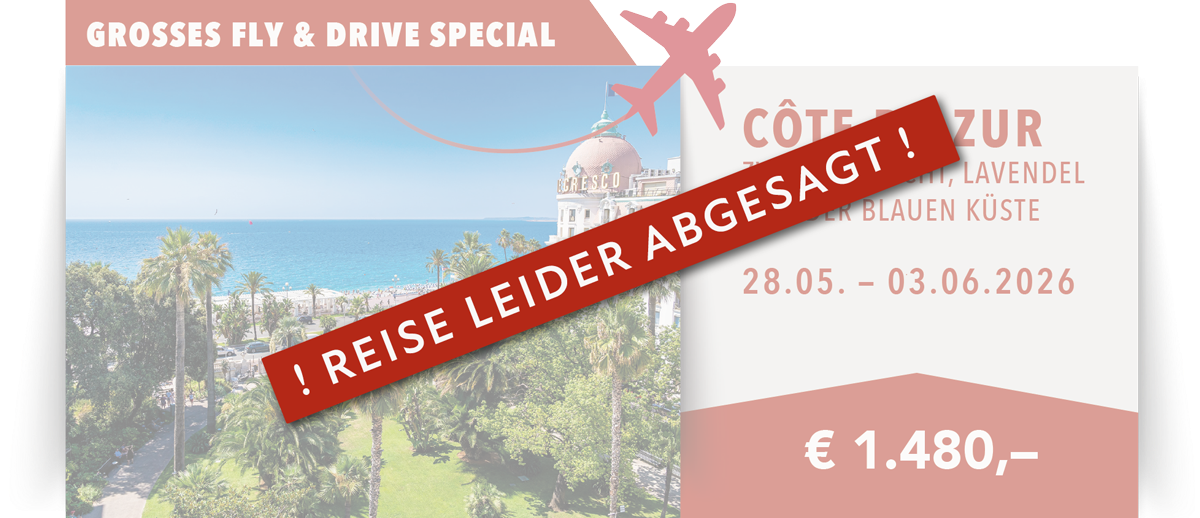 Ganztägiger Ausflug entlang der Côte d’Azur: Schon Maler wie Henri Matisse ließen sich von der Farbenpracht der „Blauen Küste“ inspirieren, und Filmklassiker wie „Über den Dächern von Nizza“ oder „Der Gendarm von St. Tropez“ erzählen von der Schönheit dieses Küstenstreifens. Wir besuchen die mondänen Jet-Set-Orte Antibes, Cannes, Fréjus und die Halbinsel Saint-Tropez mit ihrem Yachthafen und dem alten Fischerhafen. Unterwegs bleibt Zeit für eine gemütliche Mittagspause.